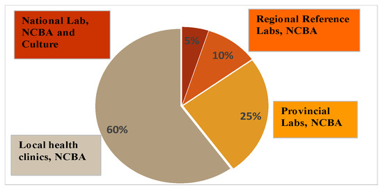 Jorgensen showed that rapid tests, such as Xpert MTB/RIF and line probe assays, which are located in the National Reference Lab, were only used by 5% of patients [47]. These tests are expensive, require a fully functional lab facility and skilled personnel. However, 60% of patients reported to peripheral health clinics, which provide primary care level. Some 25% of patients were seen at health center laboratories and 10% were seen at district laboratories [47]. Figure 7 shows the distribution of the patient usage of the TB testing facilities. Figure 7 also shows a futuristic placement of NCBA in these facilities. With NCBA’s sensitivity matching that of culture, it can provide the diagnostic needs at all TB testing facilities where culture is not available.
