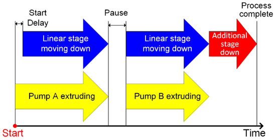 Figure 2 illustrates the sequence of operation in the fabrication system. The process starts with extrusion by Pump A, and with a short delay, the linear stage moves as the capsule is filled, so that the tip of the needle stays above the surface of the extruded material. Once the Pump A extrusion is done, a short 1-second pause is implemented to allow finishing material extrusion due to residual pressure in the syringe before Pump B starts, which follows the same sequence as that of Pump A. The extrusion rate was 6 mL/min for both needles. The period of extrusion for each pump depends on the mixture combination, as listed in Table 3. For each capsule, a total of 0.9 ml of material was extruded into the capsule. The total travel distance of the linear stage is 2 cm, with a speed of around 2 mm/sec. Once the extrusion process is completed, the linear stage moves down an additional 2 cm to allow more clearance for removing the capsule from the holder. The cap of the capsule was re-capped. The total amount of time to fabricate one capsule was 15 seconds.