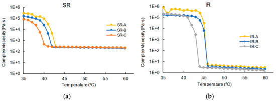 Viscosity test results: (a) SR-A, -B and -C and (b) IR-A, -B and -C.