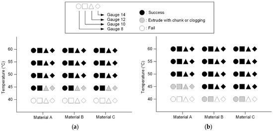 Manufacturability of different material mixtures at various temperatures: (a) SR and (b) IR. At 40 °C, both IR and SR mixture failed. Failure or clogging was observed until 45 °C in both mixtures, but from 50 °C, the extrusion was uniform and smooth.