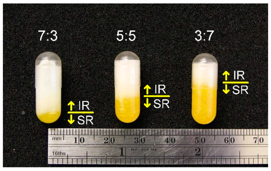 Fabricated capsules with different IR (white) and SR (yellow) mixtures. From left to right: I7S3, I5S5 and I3S7.