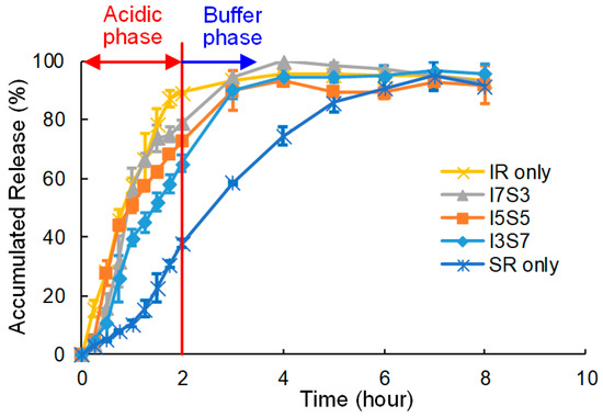 The results of the dissolution test are shown in Figure 8. In the first two hours, during the acidic phase, the plot shows a faster dissolution rate when the mixture contains higher IR. “IR only” shows more than 85% dissolution in the first two hours, while “SR only” shows less than 40% in the same period. I3S7, I5S5 and I7S3 also show a similar pattern, that faster dissolution is caused by the IR composition. From the buffer phase, SR shows a linear dissolution during 2–3 h. By 4 h, all capsules except SR only reached nearly 100% dissolution, and beyond that the changes in measured dissolution are within the measurement error.