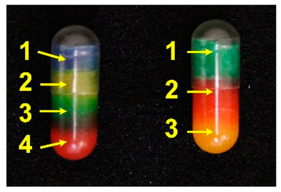 Examples of different layered capsules. Each color represents the drug. (Left) total of four layers; (right) total of three layers.