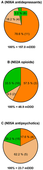 Percentage of total consumption in DDD in 2017 of drugs having actionable guidelines (orange), non-actionable guidelines (light brown), and no guideline (green) related to CYP2D6 and/or CYP2C19 for antidepressants (A), opioids (B), and antipsychotics (C). Numbers in brackets refer to the number of drugs in each category.