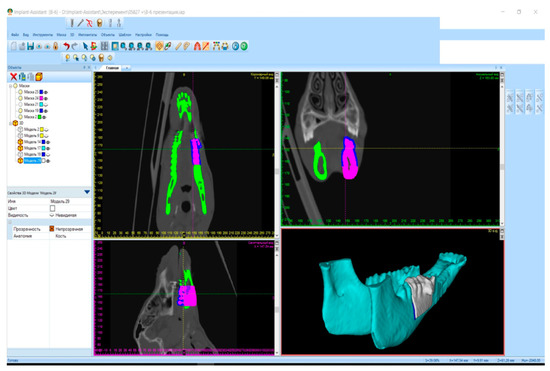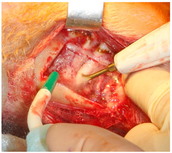 Surgical intervention began with a right-sided 6–7 cm incision on the lower jaw of the animal subject in order to expose the body of the mandible. The experiment protocol included the primary resection of the external cortical layer of the mandible at an extent of 3 cm (Figure 3), with consequent implantation of a sterilized plastic implant created via 3D printing.