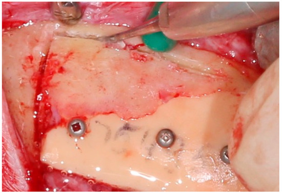 Secondary surgical intervention occurred for each subject in a different timeframe. Th extraction of the plastic implants was performed at 1, 3, 6, and 12 months after installation and was replaced with an individualized titanium implant into the bed of the removed plastic implant. The original surgical scar was excised and the previously positioned plastic implant was exposed and excised with a piezoelectric scalpel. Tissue samples were taken for histological evaluation (Figure 4).