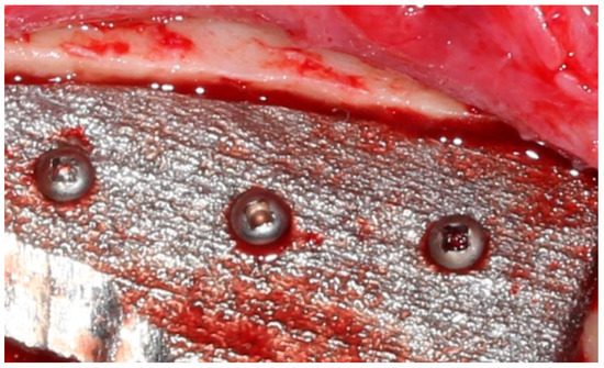 The previously printed porous titanium implant was then positioned and secured with standard screws into the area of the explanted plastic implant (Figure 5). Wound closure was then performed.