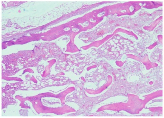 A definitive layer of osseous tissue, with many visible osteoblasts on the periphery, surrounded the implant edge. The osteoblasts had a typical cylindric form with some large dark nuclei. No endochondral ossification was noted. Multiple osteoblasts were seen close to the new bone trabeculae. There was reticular tissue growing between the trabecular space with evidence of neoangiogenesis (Figure 8).