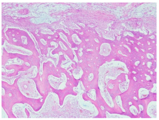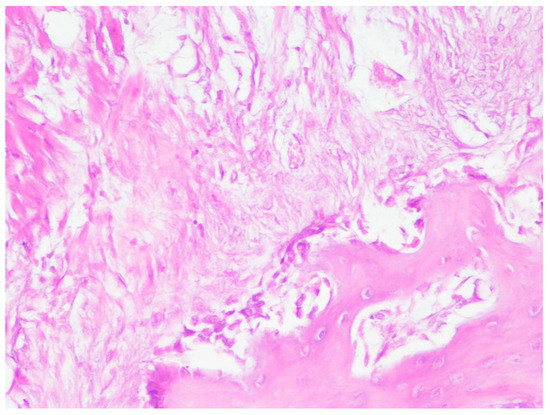 Histological examination of osseous tissue around the orthopedic screws demonstrated no evidence of granulomatous inflammation. In the area close to the implant there was a layer of dense fibrotic tissue with fibroblasts and fibrotic tissue with a trabecular structure and non-mature osseous tissue with loop-like structures (Figure 7).