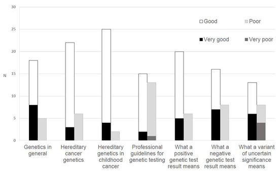 Most oncologists indicated that their knowledge of the following domains was at least ‘good’: General genetics (n = 26, 83.9%), hereditary cancer genetics (n = 25, 80.7%), hereditary genetics in childhood cancer (n = 29, 93.5%), and the meaning of a positive test result (n = 25, 80.6%) and a negative test result (n = 23, 74.2%). Fewer rated ‘good’ to ‘very good’ knowledge of the meaning of a variant of uncertain significance (n = 19, 61.3%) and knowledge of professional guidelines for genetic testing (n = 17, 54.9%; Figure 2).