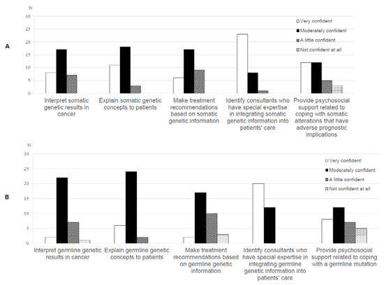 Oncologists’ (n = 35) ratings of their confidence with (A) somatic and (B) germline genetic test results.