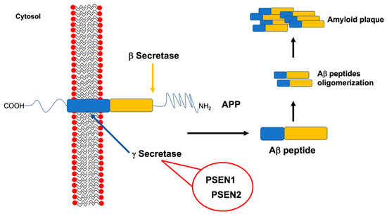 Amyloid precursor protein (APP) structure and amyloid beta (Aβ) peptide production. The cleavage of APP by specific secretases is required to produce the Aβ peptide. One of these secretases, namely the γ secretase, is a multimeric complex involving also presenilin 1 (PSEN1) and presenilin 2 (PSEN2). Mutations affecting APP, as well as PSEN1 or PSEN2 genes, have been associated to familial Alzheimer’s disease (FAD) because of their ability to increase Aβ peptides production and, consequently, their aggregation up to amyloid plaques formation.