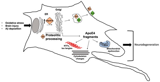 Working model for Apolipoprotein E4 (ApoE4) contribution to Alzheimer’s disease (AD) development. Different stimuli can induce ApoE4 and ApoE3 overexpression, with E4 contribution to neurodegeneration in AD. ApoE4, undergoing to proteolytic cleavage, can generate different fragments which can contribute to mitochondrial dysfunction, cytoskeletal disorganization, neurofibrillary tangles and, consequently to neurodegeneration.