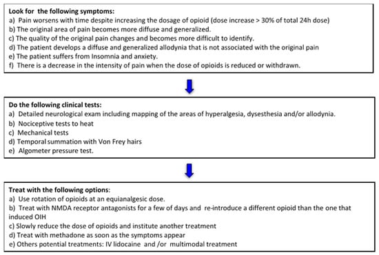 This study confirmed that OIH was not as prevalent as had been anticipated, and that the clinical prevalence of OIH in patients after surgery, as well as those suffering from chronic non-cancer pain or chronic cancer pain, is unclear. Additionally, almost 3/4 of physicians did not use a clinical test to ascertain a diagnosis of OIH, which may cause confusion in the clinical interpretation and management of the condition. The treatment modalities used by physicians in this study were consistent with those suggested in the literature. The most frequently used treatments were the addition of an NMDA antagonist, combined with lowering the opioid doses and using opioid rotation. Finally, based on the results of the study, the authors propose an algorithm detailing the symptoms to look for, the clinical tests to conduct, and the treatment to apply in the presence of suspected OIH [11].