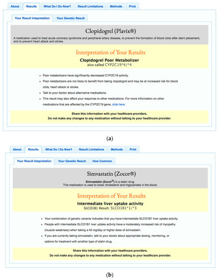 Example Coriell Personalized Medicine Collaborative (CPMC) pharmacogenomic (PGx) reports. Figure 1 displays example PGx reports for (a) clopidogrel and (b) simvastatin.