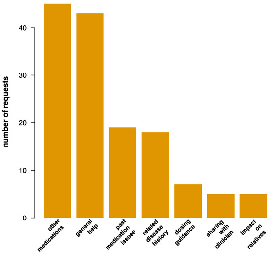 Nine percent of PGx genetic counseling requests were seeking guidance on more concrete next steps that should be taken in light of the results. These included determining whether a dose change may be needed for a currently prescribed medication or whether a change in treatment approach to a different drug may be indicated by the results. These individuals were referred back to their prescribing healthcare provider or pharmacist for medication management guidance.
