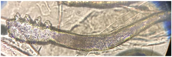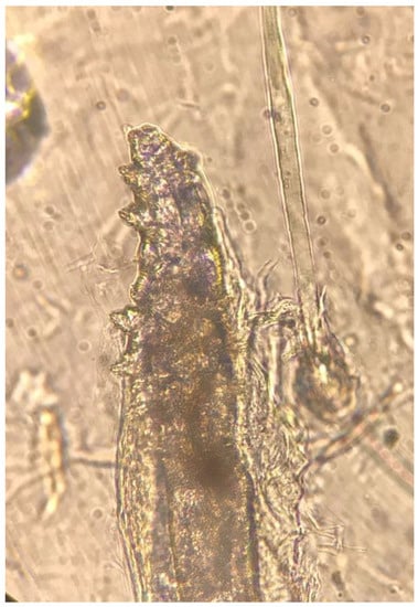 - Rufli, T.; Mumcuoglu, Y. The hair follicle mites Demodex folliculorum and Demodex brevis: Biology and medical importance. A review. Dermatologica 1981, 162, 1–11. [Google Scholar] [CrossRef] [PubMed]