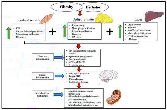 Overview of the diverse mechanism involved in obesity and diabetes-induced systemic and neuro-inflammation in mitochondrial and brain health. Skeletal muscle, adipose tissue, and liver are involved in glucose and lipid metabolism and play a vital role in developing adipose tissue dysfunction and insulin resistance during the obese condition. In obesity and diabetes, elevated free fatty acid, increased secretion of pro-inflammatory cytokines and macrophage infiltration, AGE and RAGE generation, and ER stress induce systemic inflammation. Systemic inflammation progressively initiates microglial activation, endothelial damage, and BBB disruption, which eventually leads to neuro-inflammation. These unfavorable inflammatory events alter the mitochondrial energy metabolism, mitochondrial dynamics, and biogenesis to escalate the mitochondrial oxidative stress collectively and trigger the mitochondrial assault. This gradually results in synapsis loss and neuronal death. FFA—Free Fatty Acid. ER—Endoplasmic Reticulum. AGE—Advanced Glycation End Products. RAGE—pattern recognition receptors of AGE. BBB—Blood-Brain Barrier.