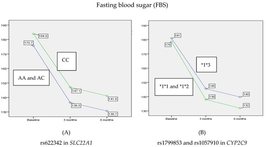 The main effect of rs622342 in SLC22A1 and rs1799853/rs1057910 in CYP2C9 on reducing the average of FBS after 3 and 6 months. rs622342 in SLC22A1 was negatively associated with FBS (p = 0.021). rs1799853 and rs1057910 in CYP2C9 did not show any significant effect on FBS levels (p = 0.156). HbA1c: glycated hemoglobin; FBS: fasting blood sugar.