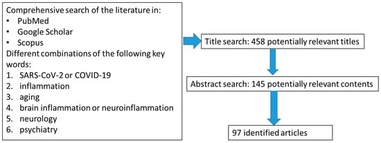 In order to further clarify the causes behind the sharp increase of COVID-19 fatality with age, in this narrative review we explore in general the mechanisms of inflammatory reactions modified by senescence, and focus in particular on age-dependent chronic neuroinflammation and related neurocognitive and neuropsychiatric disorders. Such brain conditions, frequently observed in older people, may relate to COVID-19, possibly being involved in the development of disease neurological/psychiatric manifestations, facilitating SARS-CoV-2-induced respiratory damage and organ failure and acting as a potential hazard for the future health of recovered patients. For these reasons, aging-dependent chronic neuroinflammation represents an interesting topic for discussion for stimulating an early identification and management of high-risk severe cases of COVID-19 and for a better understanding of its pandemic consequences. In particular, as summarized in Figure 1, we have conducted a review of the literature to identify studies investigating the implication of aging-related chronic inflammation and providing evidence or suggestions on the impact of neuroinflammation in the COVID-19 pandemic. We employed commonly used academic engines (PubMed, Google Scholar, Scopus) to search relevant literature through July 2020, and the following key words: “SARS-CoV-2” or “COVID-19”, “inflammation”, “brain inflammation” or “neuroinflammation” have been used in combination with any of the following terms: “aging”, “neurology” and “psychiatry”. The reference list of identified original articles was also hand-searched to obtain additional articles. Studies were considered for inclusion if they were published in English in a peer-reviewed journal; included patients diagnosed with the neuropsychiatric disorders of interest according to International Classification of Diseases (ICD) or Diagnostic and Statistical Manual of mental disorders (DSM) criteria, and included a minimum number of patients to be sufficiently informative. Studies were excluded if there were no data about patients’ neuropsychiatric disorders; sample characteristics were not sufficiently described; and if the study was a case series report of no interest. A total number of 97 studies were considered. Eligibility assessment and study selection were performed by a first author (PB) and independently checked by another author (GS). Overall, the aim of the present review is to obtain a global and synthetic perspective on a topic of emergent interest in the new field of the COVID-19 pandemic and not to describe extensively data of all published studies. Thus, here data of reports describing similar implications might also be represented by individual studies.