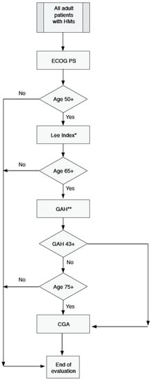Proposed algorithm for systematic age-adapted patient general condition evaluation at diagnosis in adult patients diagnosed with hematological malignancies. HMs, Hematologic malignancies; ECOG PS, Performance status according to ECOG scale; LEE INDEX (Lowcase); Lee’s Index for Older Adults []; GAH, Geriatric Assessment in Hematology []; CGA, Comprehensive Geriatric Assessment. * In times of crisis, the evaluation might be simplified to the first two steps: ECOG and LEE in 50+. ** For patients 65+, GAH might also be substituted by the six-item version [] of the G8 questionnaire (abnormal geriatric assessment if the score is 6 or more points) in both hematological and non-hematological patients.