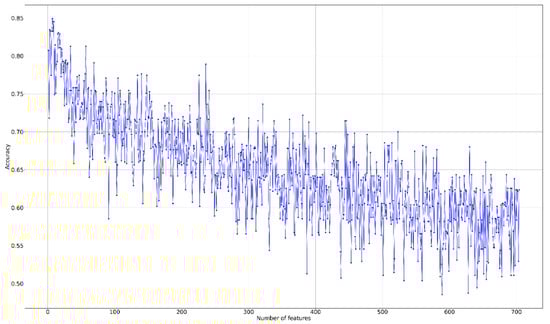 where , , and are the averages of the ith feature of the whole, positive, and negative datasets, respectively, and and are the ith feature of the kth positive and negative instance, respectively. F-score values of 704 radiomics features were first computed and then ranked from the largest to smallest to observe the top-important features. Next, RFE was performed to fit our model and remove the weakest feature (or features) until the specified number of features was reached. Thereafter, the threshold point, which yielded the best performance, was selected as our optimal cutoff point for feature selection.