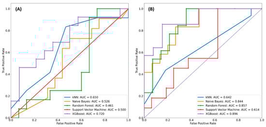 Machine learning is a popular technique in the field of artificial intelligence, which enables automatic extraction of salient image features from extensive datasets, leading to a more precise prediction []. Many studies have demonstrated that machine learning achieves a promising performance in tumor segmentation, tumor classification, and survival or genotype prediction [,,,]. In the radiomics field, machine learning algorithms (both supervised and unsupervised learning) could help to determine the informative radiomics features, thereby accurately predicting the outcomes. We attempted five classification algorithms in this study, and on the basis of their performance, we subsequently selected the best algorithm to build the final classification model. Among the five different classifiers, kNNs and Naïve Bayes are simple algorithms on the basis of distance function learning and Bayes theorem, respectively. Next, SVM is a common machine learning algorithm based on the notion of decision plane, and it is primarily used for the classification tasks. Its goal is to determine the optimal dividing hyperplane that maximizes the margin of the training data. The last algorithms are both ensemble methods including Random Forest and XGBoost that ensemble the individual outcome predictions, and the model that receives the most votes becomes the final model. We also performed a grid search on cross-validation to determine the best optimal parameters for all aforementioned machine learning algorithms.
