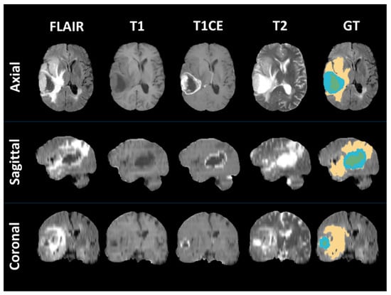 The MRI scans were segmented according to the criteria of the Brain Tumor Segmentation (BraTS) challenge []. According to this criterion, brain tumors could be classified into three sub-regions: (1) the enhanced part of the tumor core (ET) is characterized on the basis of areas displaying hyperintensity in T1-Gd, when compared with both T1 and normal/healthy white matter (WM) in T1-Gd. Areas showing contrast leakage of disrupted blood–brain barriers (often observed in high-grade gliomas) are represented using ET; (2) the nonenhanced part of the tumor core (NET) is used to represent regions that show no enhancement and particularly nonenhanced transitional/prenecrotic and necrotic regions in the tumor core that are usually resected in addition to the ET. The NET shows hypointense appearance in T1-Gd in comparison with both T1 and normal/healthy WM in T1-Gd; and (3) finally, a hyperintense signal on the T2-FLAIR volumes is used to describe the peritumoral edema. In this study, we used the benchmark segmentations from a previous study [], whereby the authors proposed standard segmentations (manually by radiologist experts) as well as radiomics features for TCGA-GBM studies. Figure 3 shows an example of how the ground truth of GBMs has been segmented.