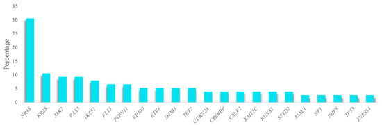 A total of 86.7% of the analyzed samples (65/75) featured a mutation in at least one of the genes studied, with a mean of 1.8 mutations per patient (range 0–6). One hundred and fifty-three variants were selected after applying the quality filters and removing SNPs and possible sequencing artifacts, of which most were non-synonymous SNVs (83.1%). These variants were detected in 55 of the genes studied. The most frequently altered gene was NRAS, which was detected in 30% of patients, followed by KRAS, JAK2, PAX5, and IKZF1, which were detected in more than 8% of the cohort (Figure 1). Over 70% of the mutations detected in the NRAS and KRAS genes were the hotspots located at codons 12 and 13. Furthermore, mutational hotspots R683 and T875 of JAK2 were the most recurrent mutations observed in this gene (Table S12).