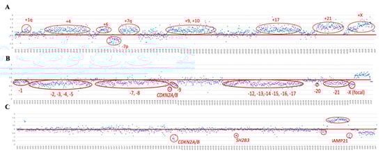 Dot plot of copy number variations (CNVs). This figure shows the dot plots of three samples for the detection of CNVs. The x-axis represents the chromosome regions included in the custom NGS panel, in increasing order from chromosome 1 to X. The y-axis shows the values of the log2 ratio. The red lines indicate the reference, and in the red circles, there are the chromosomal regions above or below the reference, showing the respective gain or loss of that region. (A) Dot plot of the ID37 sample, showing a high hyperdiploid clone with the gain of chromosomes 1q, 4, 6, 7q, 9, 10, 17, 21, and X, in addition to the loss of 7p. (B) Dot plot of the ID43 sample, showing a near-haploid clone with the loss of chromosomes 1, 2, 3, 4, 5, 7, 8, 12, 13, 14, 15, 16, 17, 20, and 21. (C) Dot plot of the ID44 sample, showing the loss of the CDKN2A/B and SH2B3 genes, and of iAMP21.