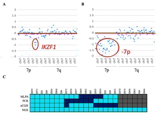 IKZF1 loss. (A) Dot plot of CNV representation, showing IKZF1 gene loss. (B) Dot plot of CNV representation, showing loss of 7p, which includes the IKZF1 gene. The x-axis represents the chromosome regions included in the custom NGS panel, in increasing order from chromosome 1 to X. The y-axis shows the log2 ratios. The red lines indicate the reference, and the chromosomal regions above or below the reference are those inside the red circles, indicating the respective gain or loss of that region. (C) IKZF1 loss detected by NGS compared with the results obtained by conventional multiplex ligation-dependent probe amplification (MLPA), PCR, and aCGH techniques. Turquoise, detected; dark blue, not detected; grey, no information available. Each column represents one patient.