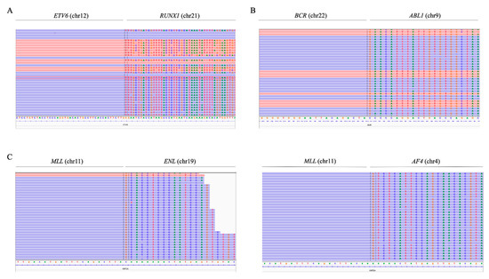 Finally, we evaluated the sensitivity and effectiveness of the custom NGS panel in detecting the main fusion genes associated with B-ALL patients: the ETV6/RUNX1 fusion gene (reported in 25% of children and 1–3% of adults), the BCR/ABL1 fusion gene (reported in 10% of children and 20% of adults), and MLL rearrangements (reported in 6% of children and 9% of adults) [1,2,35]. The NGS panel was able to identify all fusion genes included in the panel. Furthermore, it enabled fusion genes to be detected with high sensitivity, confirming the presence of the various fusion genes in patients with the fusion in a small percentage of cells, detecting even cases that were not reported by conventional techniques. In MLLr cases, the NGS panel only detected 70% of the cases confirmed by cytogenetics because only the region where the most frequent MLL breakpoints occur was included in the panel design. Twenty percent of MLLr-positive patients might present the breakpoint in a different position and, therefore, not be detected by the panel.