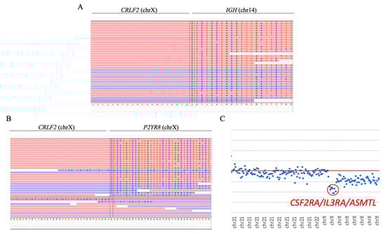 Both cases with CRLF2 rearrangements were successfully detected. In sample ID47, the CRLF2/IGH fusion gene was observed as a product of t(14;X) (Figure 5A). Moreover, sample ID48 showed the presence of the CRLF2/P2YR8 and CRLF2/IGH fusion genes. The presence of the CRLF2/P2YR8 fusion gene was also determined by the detection of the loss of the genes CSF2RA, IL3R, and ASMTL (Figure 5B,C). CRLF2 rearrangements were observed in four other samples in which the rearrangements were not reported by conventional techniques.