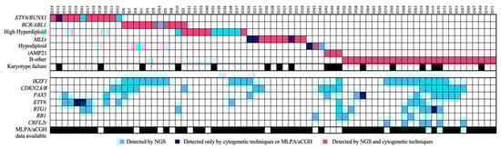 Genetic findings from the combined analysis of the custom NGS panel and standard-of-care diagnostics. The figure summarizes the genetic alterations observed in the series of B-ALL patients, where columns and rows represent patients and genetic alterations, respectively. The upper box shows the alterations that allow patients to be classified by biological risk groups. Turquoise, dark-blue, and pink boxes, respectively, indicate the alterations detected exclusively by the custom NGS panel and cytogenetic techniques and those detected by both. In the lower box, the different secondary alterations detected correspond to the loss of the genes indicated in the different rows and to the rearrangements of the CRFLF2 gene.