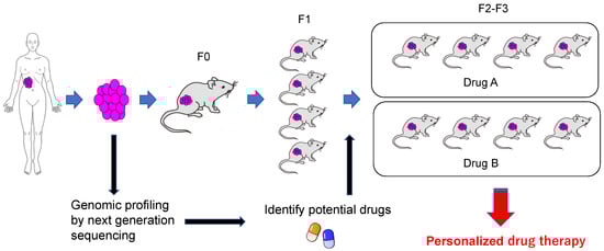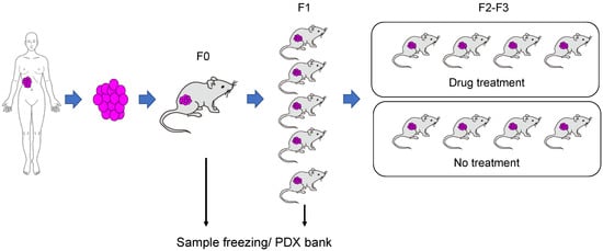 A PDX model is created by grafting a patient-derived tumor sample into immunodeficient mice (Figure 1) [,]. Usually, tumor growth begins within several months after grafting (F0). At that time, part of the graft is used for genetic analysis, such as whole-exome sequencing, RNA sequencing, and copy number alteration, to analyze the genetic characteristics of the tumor, and another part of the graft is stored in the PDX tissue bank. Part of the tissue is grafted into immunodeficient mice (F1), and the tumor after proliferation is frozen in a large quantity. If these tumor samples are grafted simultaneously into numerous mice and candidate drugs are administered to the mice, it is possible to screen and identify drugs that are effective against the patient’s tumor. If the results of gene analysis are compared with the clinical data, it is possible to cultivate the path for personalized treatment. With the PDX model, tumor growth in vivo in mice accelerates as passaging is repeated. In the F3 generation, the patient-derived sample is approximately identical to the genetic expression profile. Thereafter, the genetic profile changes with further passaging []. For this reason, it has been recommended to use tumor of F3 or earlier generations in PDX model-based evaluation.