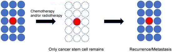 Previously, cancer was considered to be a group of single cells that deviated from the normal mechanism for preserving the living body, resulting in permanent proliferation. However, it has been increasingly recognized that a group containing a small number of cells called “cancer stem cells” is present in both blood tumors and solid cancers []. According to this cancer stem cell hypothesis, stem cells similar to normal tissue are also present in tumor tissue, and they have the potential for self-renewal, accompanied by the ability to form a tumor similar to the original tumor tissue despite being small in number []. Cancer stem cells are considered to maintain stemness for a long period, similarly to tissue stem cells. They divide more slowly than daughter cells, and thus, they are resistant to conventional anti-cancer drugs or radiotherapy (Figure 2) []. Furthermore, it has been suggested that these cells exhibit relatively strong resistance to molecular targeted drugs []. Therefore, the risk for recurrence or metastasis is considered high if cancer stem cells are not eradicated, even in cases in which the tumor is not clinically detectable after treatment. Furthermore, recurrent or metastatic cancer usually has high resistance to drugs, and therefore, it has been highlighted as a major factor for poor prognosis. Under such circumstances, treatment methods targeting cancer stem cells are anticipated as a promising therapeutic strategy.