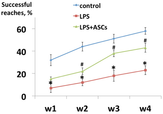 In the group of animals with ASCs transplantation after LPS injection the recovery of corticospinal function was observed at all time points and by the fourth week the number of successful attempts was 43 ± 4% (