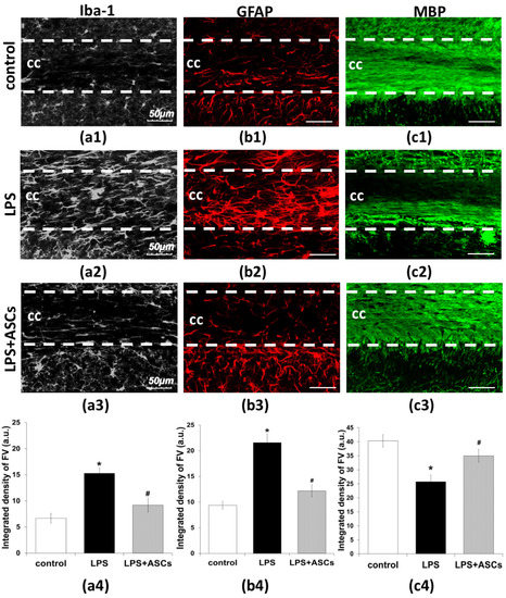 Figure 2(a4)). The transplantation of ASCs after LPS injection increased the MBP-immunopositive signals compared with LPS-treated animals (