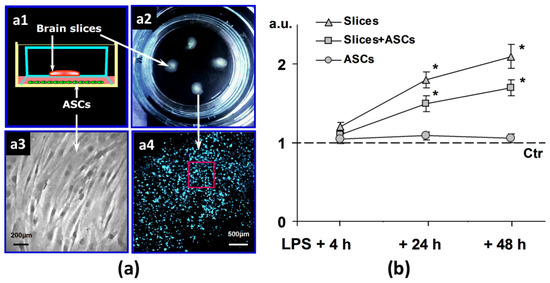 For non-contact co-culture, immediately after inducing neuroinflammation with LPS in vitro, inserts with brain slices were transferred to other 6-well plates with earlier adhered ASCs (4 × 104 cells per well). The porous semitransparent membrane of insert was permeable to soluble factors, but prevented direct cell-to-cell contact.