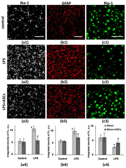 Immunohistochemical analysis revealed that the transplantation of ASCs after LPS injection decreased the Iba-1- and GFAP-immunopositive signaling, in comparison with LPS-treated animals (