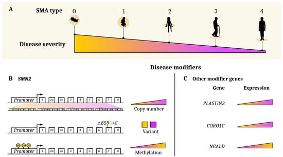 Known molecular disease modifiers. (A) Current classification of SMA as a discrete projection of a continuous spectrum of disease severity. This spectrum results from the combination of (B) disease modifiers such as SMN2 copy number, SMN2 variant, and methylation state; (C) level of expression of CORO1C and PLASTIN3 was associated with milder phenotype, while NCALD overexpression was associated with more severe phenotype.