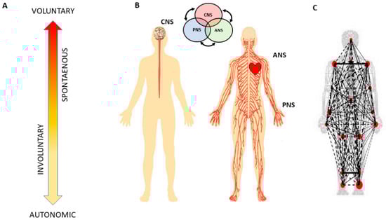 Defining quantitative aspects of agency for the study of embodied cognition. (A) A highly simplified schematics reflecting the phylogenetically orderly taxonomy of nervous system functions involving different levels of voluntary control (intent) ranging from deliberate to spontaneous movement segments, to involuntary motions and autonomic control. Levels correspond to three fundamental muscle types (skeletal for voluntary, smooth for involuntary, and cardiac for autonomic.) Multi-layered signals contributing from each of these layers are proposed to differentially contribute to the sense of action ownership and to the overall sense of agency via sensory consequences preceded by different levels of intent. (B) Contributions of the central and peripheral nervous systems (CNS and PNS, respectively), including the autonomic nervous system (ANS), can be tracked in a closed loop that helps the autonomous realization of intended thoughts into physical actions under volitional control. (C) Network connectivity analyses of kinematics and heart biorhythmic signals encompassing these levels of control enable the study of agency through objective quantitative methods.