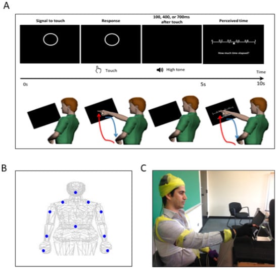 Experimental assay and instrumentation setup. (A) Experimental procedure. In a single trial, the participant was presented with a display screen, as shown on the top panel. During the first 5 s, the participant was presented with a circle as a prompt to touch the circle on the screen. After the touch, the participant heard a tone. The duration between the touch and the tone was randomly set to be 100 ms, 400 ms, or 700 ms. In the next 5 s, the participant was presented with a sliding scale, where s/he indicated how long the time was perceived to have elapsed between the touch and the tone, by touching the corresponding number on the scale. For each trial, the participant made two pointing gestures—one to touch the circle and another to indicate their time estimation on the sliding scale. Such pointing gesture was composed of a forward reaching segment (red) and a backward retracting segment (blue), as shown in the bottom panel. (B) Motion capture sensor positions. The sensors were attached on the following body parts: center of the forehead, thoracic vertebrate T7, right and left scapula, right and left upper arm, right and left forearm, non-performing hand, and the performing hand’s index finger. (C) Snapshot of the experiment. During the experiment, the participant was seated in front of the tablet screen to perform the tasks, and wired sensors were secured with athletic tape.