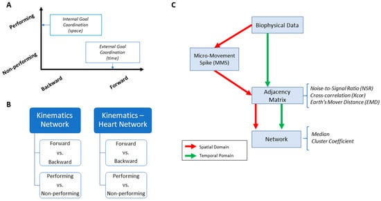 Overview of analytics pipeline. (A) Behavioral assay to quantify ranges of motor intent along two axes to highlight externally and internally defined goals. Along the former, motions are classified across time based on the end-effector’s movement, ranging from backward–spontaneous (lower motor intent) to forward–deliberate (higher motor intent) motions. Along the other axis, motions are classified across locations of the body, based on the proximity to the end-effector, from non-performing side of the body parts (lower motor intent) to the performing side including the end-effector (higher motor intent). Note, the two axes are not necessarily orthogonal as the schematics imply. (B) Two types of network analyses were made. Within the kinematics network, kinematics data served to compare patterns of variability from movement segments of higher level of intent (deliberately aimed at the goal) and movement segments with lower level of intent (spontaneous retractions of the hand to rest, without instructions), including as well comparison of patterns from the performing and non-performing parts of the body. Within the kinematics-heart network, a similar comparison was made, with a layer of autonomic function added, using signals from the EKG sensors. (C) For the spatial domain of connectivity analysis, raw biophysical data (biorhythms) co-registered from multiple layers of the peripheral and autonomic nervous systems were converted to MMS and used to compute pairwise similarity/synchronicity metrics to build adjacency matrices to represent weighted/undirected graphs. For the temporal domain, the raw biophysical data were directly used to build adjacency matrices. For both domains, with the obtained adjacency matrices, network connectivity analyses combined with non-linear dynamical systems approaches were used to identify self-emerging kinematic synergies and various indexes to enable objective quantification of the embodied cognition phenomena.