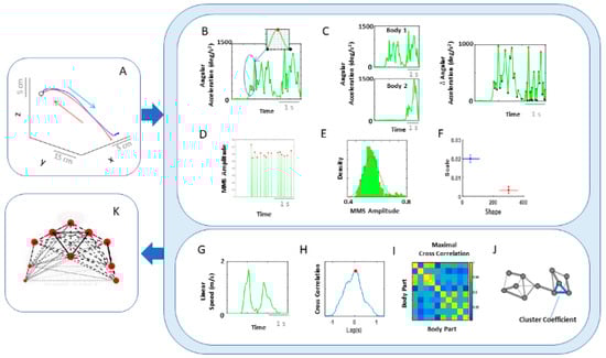 For the temporal domain, we computed pairwise cross-correlations, along with lag, between the EKG filtered time series and each body part’s linear velocity time series. In fact, in our analysis, we found an interesting pattern in directionality (i.e., lag) of correlation and deemed it informative to present them in the network graph. For that reason, edge thickness was represented by the median cross-correlation values, and color of the edges were visualized, where red indicated EKG signals leading linear velocity signals, and blue indicated linear velocity leading EKG signals (Figure 5G).