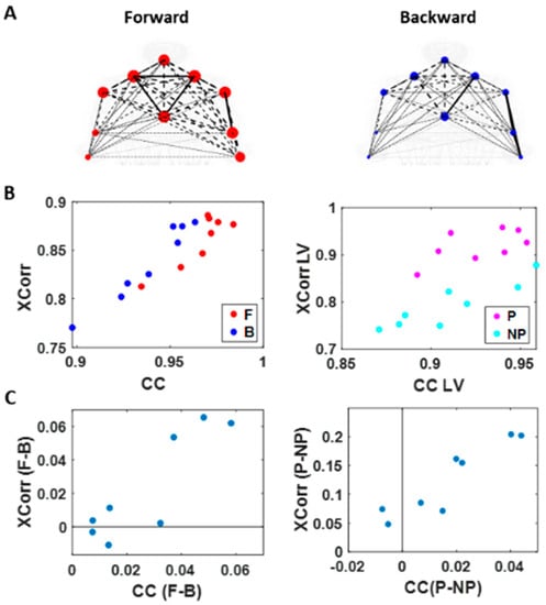 Network connectivity metric (cluster coefficient) and median cross-correlation differentiates between levels of intent. (A) Network visualization of a representative right-handed participant. Cross-correlation is represented by the line weight and cluster coefficient (CC) by the node size, during the forward (left) and backward movement segments (right). (B) Median cross-correlation (y-axis; Xcorr) and CC (x-axis) of linear speed for each participant’s movement segment (left) and different sides (right). Forward motions (red) and performing side (pink) exhibits higher cross-correlation and CC values than backward segments (blue) and non-performing side (cyan). (C) Median cross-correlation and CC difference for different movement segments (left) and different sides (right). Each participant’s data is denoted as a single marker. Higher motor intent tends to show higher cross-correlation and CC values.