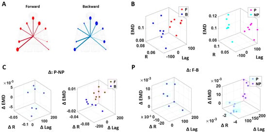 Differentiation of spatial and temporal connectivity within the kinematics-heart network according to levels of motor intent. (A) Network visualization of a right-handed representative participant. 1/EMD is represented by the node size, and median correlation is represented by the line weight. The color of edges indicates the temporal directionality between signals, where red indicates that heart leads the body linear speed and blue indicates that body linear speed leads the heart signals. (B) Median EMD (z-axis) and correlation (x-axis) and lag (y-axis) for each participant’s movement segment (left) and different sides (right). There is an overall pattern where higher motor intent (denoted by red for forward motions, and pink for performing side) is exhibited by lower correlations and EKG leading the kinematics signal (i.e., lag is positive value). (C) Median EMD, correlation, and lag difference for different sides (left), and this difference separated by movement segment (right). We find a pattern where pairwise EMD show higher differentiation under higher motor intent on the performing side, but only when forward motion was made. (D) Median EMD, correlation, and lag difference for different movement segments (left), and this difference separated by sides (right). We find a pattern where pairwise EMD show higher differentiation under lower motor intent on the non-performing side, but only when the backward motion was made.
