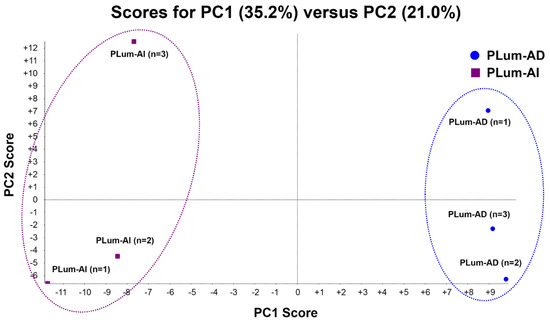 Principle component analysis (PCA) of protein profiles. PCA projection of protein profiles of PLum-AI and PLum-AD cells obtained from three independent biological samples for each cell line.