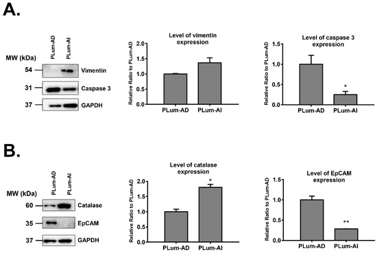 Western blot validation of four proteins identified by mass spectrometry to be differentially expressed in PLum-AI relative to PLum-AD cells (n = 3). (A) Western blot validation of vimentin and caspase 3 proteins. (B) Western blot validation of catalase and EpCAM proteins. Bands were detected by enhanced chemiluminescence (ECL) using the ChemiDoc MP Imaging System. Protein expression was quantified using Image Lab software, relative to the expression of glyceraldehyde 3-phosphate dehydrogenase (GAPDH), a housekeeping gene equally expressed in treated and non-treated cells/spheres. Results are expressed as relative ratio to control. Data represent an average of three independent experiments. The data are reported as mean ± SEM. (* p < 0.05, ** p < 0.01; PLum-AI cells compared to PLum-AD cells, student independent t-test).