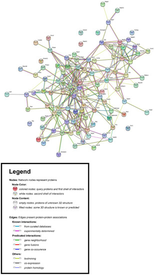 - Szklarczyk, D.; Franceschini, A.; Wyder, S.; Forslund, K.; Heller, D.; Huerta-Cepas, J.; Simonovic, M.; Roth, A.; Santos, A.; Tsafou, K.P.; et al. STRING v10: Protein-protein interaction networks, integrated over the tree of life. Nucleic Acids Res. 2015, 43, D447–D452. [Google Scholar] [CrossRef] [PubMed]